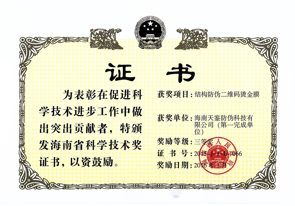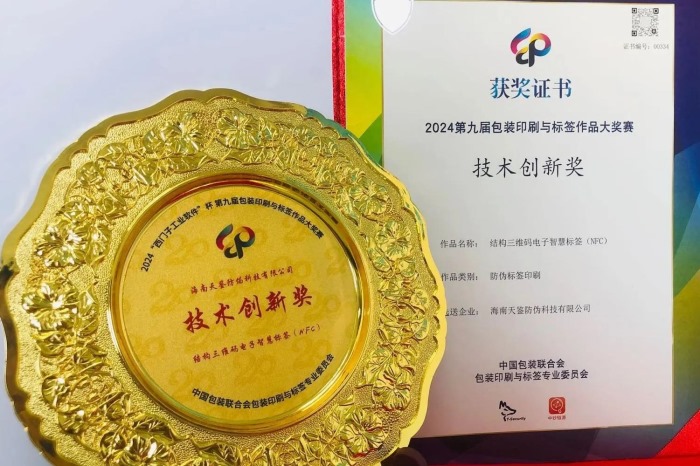 喜訊!海南天鑒防偽科技有限公司榮獲第九屆包裝印刷與標(biāo)簽作品大獎(jiǎng)賽技術(shù)創(chuàng)新獎(jiǎng)!2024-12-20